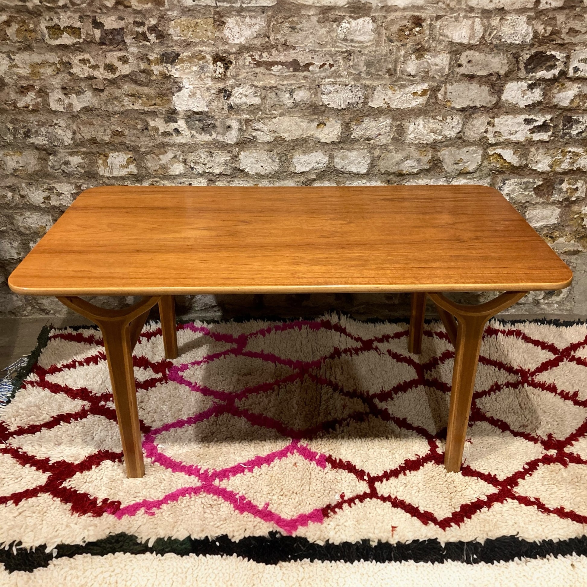 Ax coffee table designed by Orla Molgaard and Peter Hvidt for Fritz Hansen. Features a teak top with inlaid beech legs. The table has been repolished and is in excellent condition.