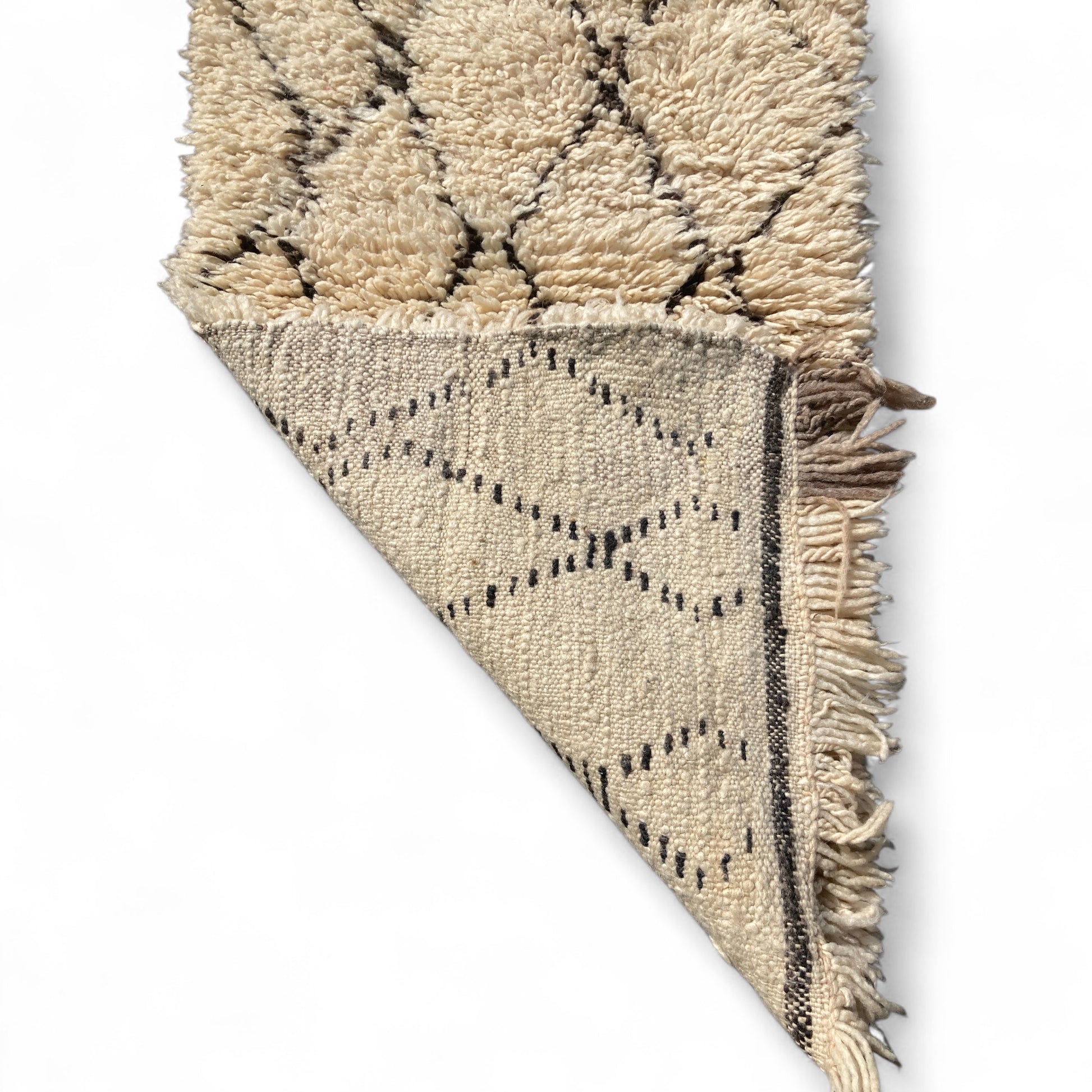 Tinker may be mini in size but he holds all the character of his mighty Beni peers! Soft, shaggy, handwoven thick pile Beni Ouarain rug with natural dark brown wool in an organic (and wonderfully wonky) diamond pattern with mottled natural wool tassels to one end.
