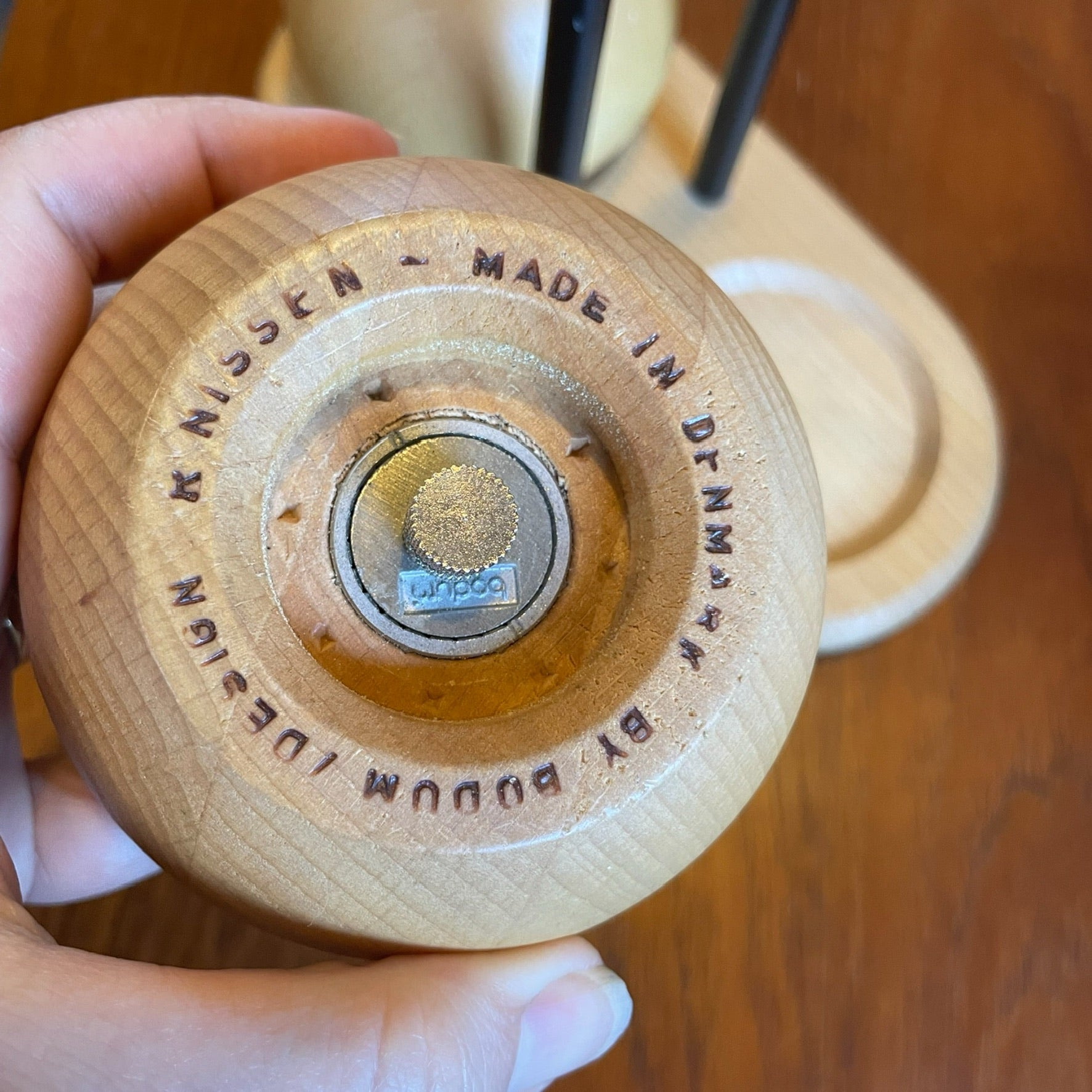 Fabulous salt and pepper mills designed by Richard Nissen for Bodum. The mills are matching tray are made from beech wood and are ball shaped making them great to hold and use.