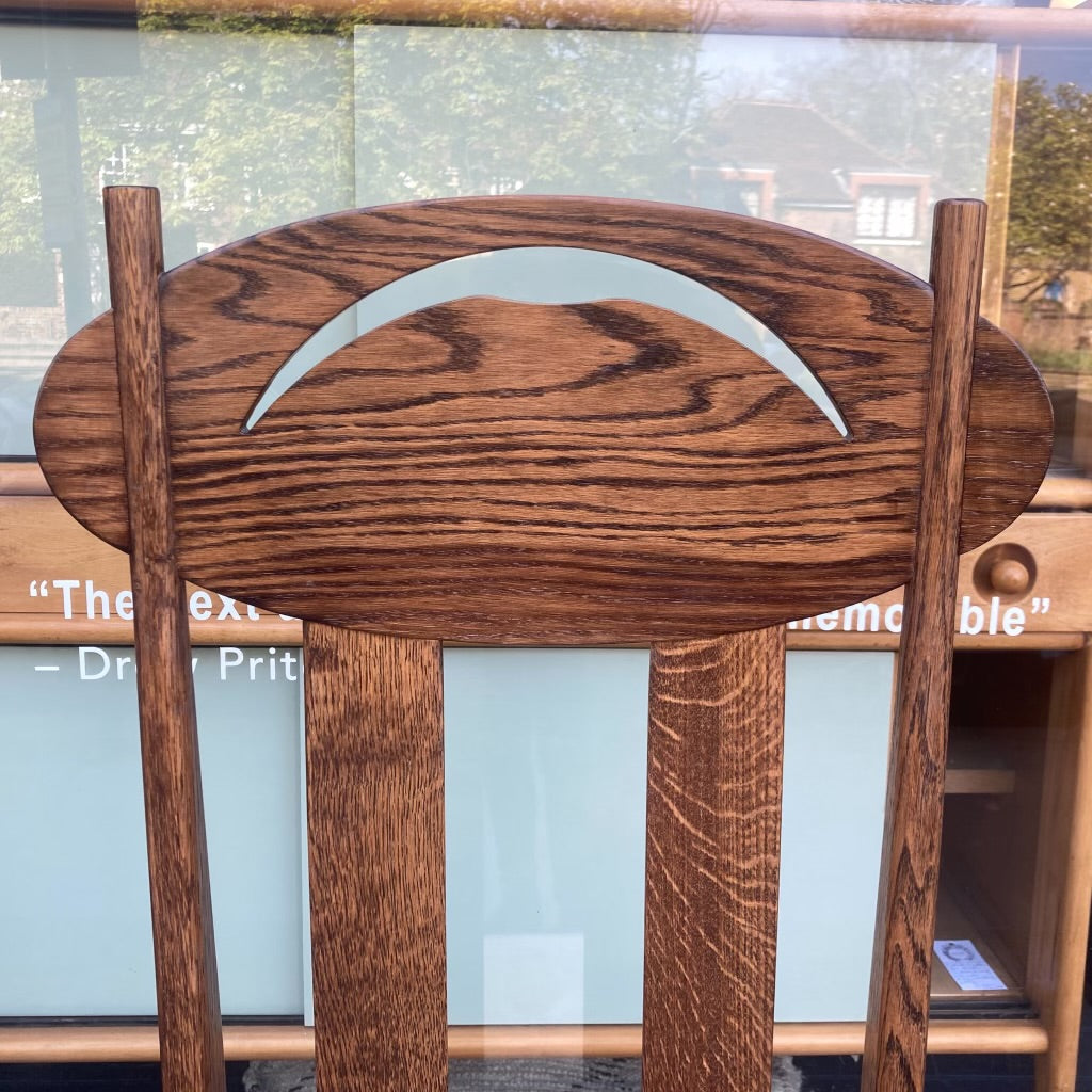 Set of eight oak dining chairs in the style of Charles Rennie Mackintosh's Argyle chair. A matching oak table is available upon request.
