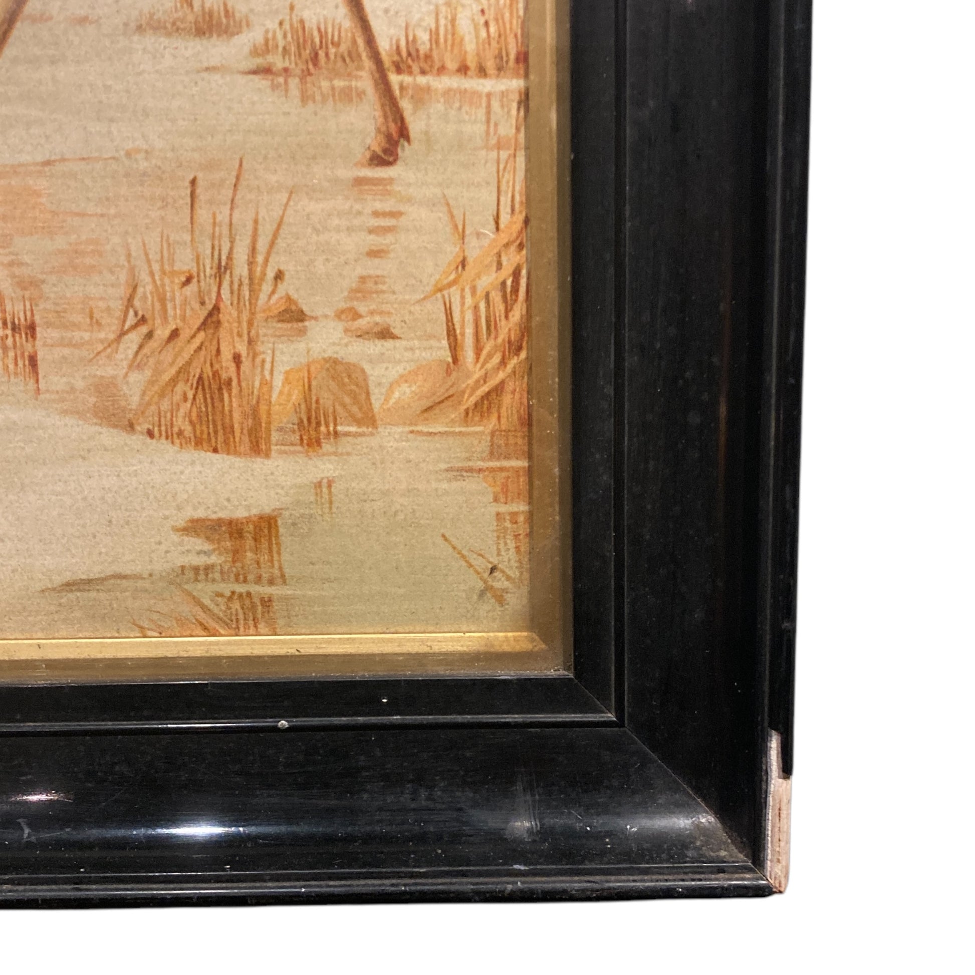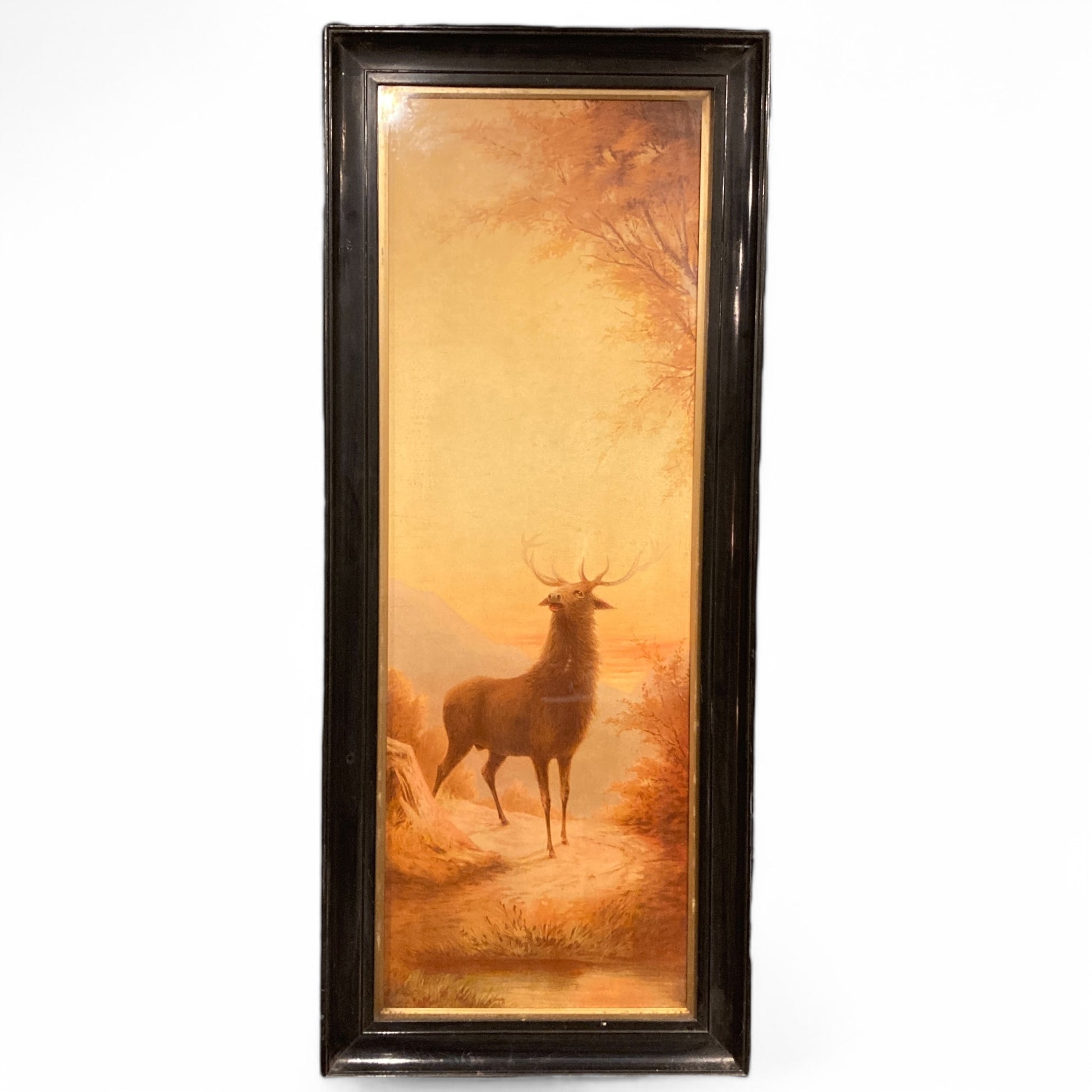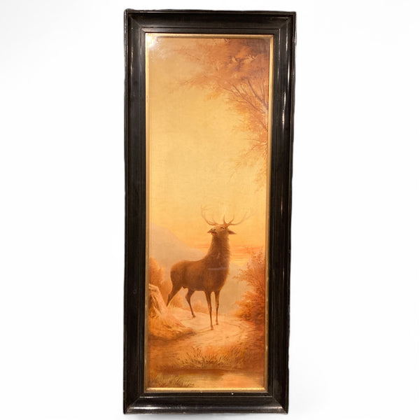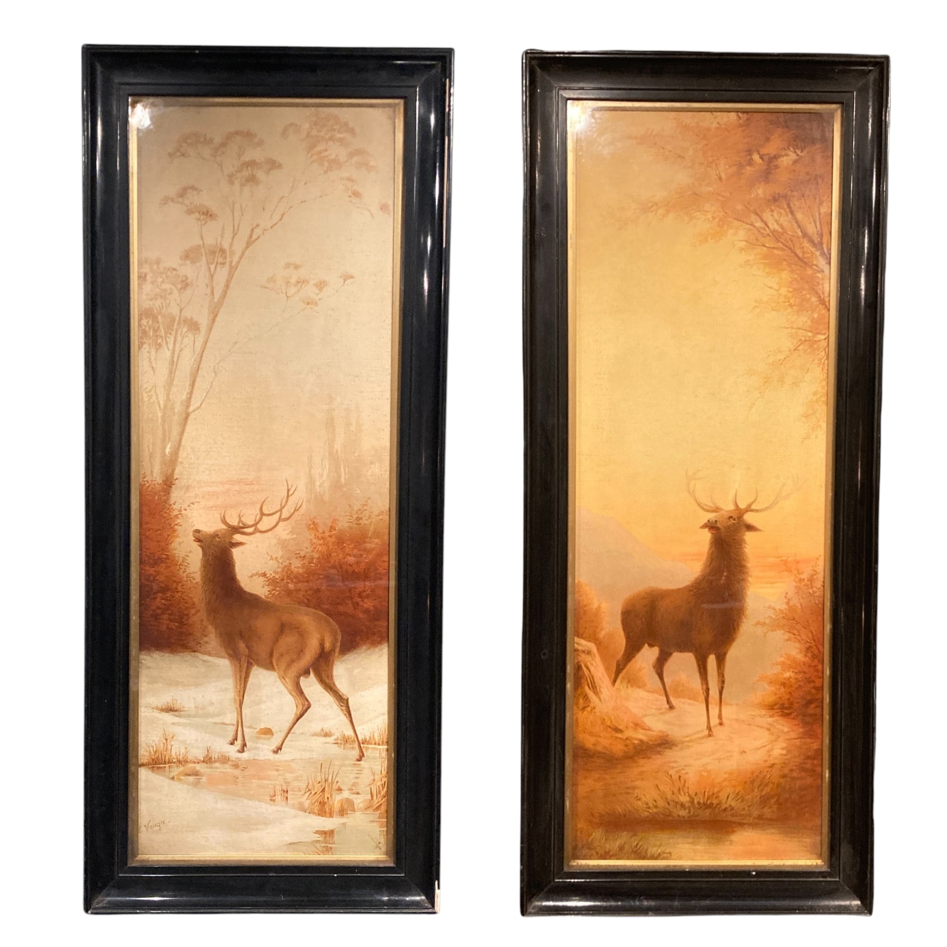 Emilie Vouga (Swiss, 1840-1909), pair of late 19th century chromolithographs of stags displayed in black lacquered frames. In good vintage condition with some losses to the lacquered frames.