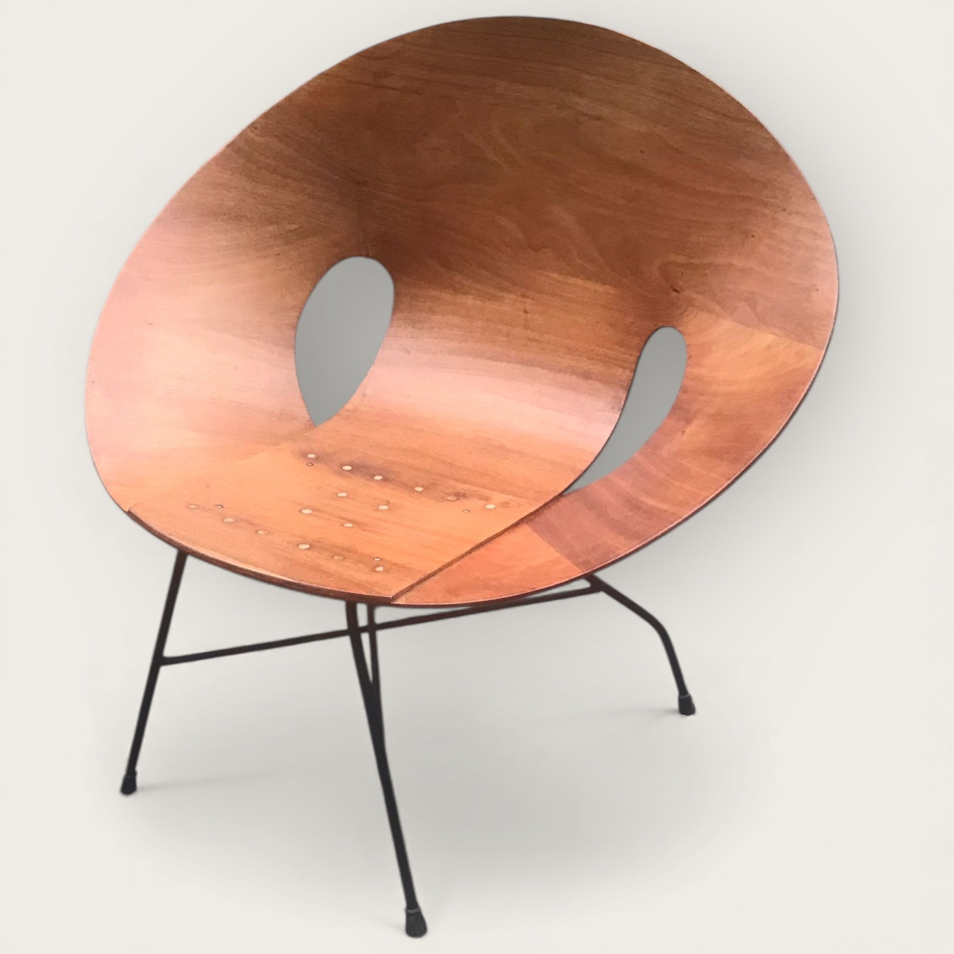 Rare Midcentury bentwood chair believed to be by Eddie Harlis for Thonet, 1950s. Possibly a prototype as larger than his traditional designs. Bent walnut ply on a metal frame with detailed brass fittings.