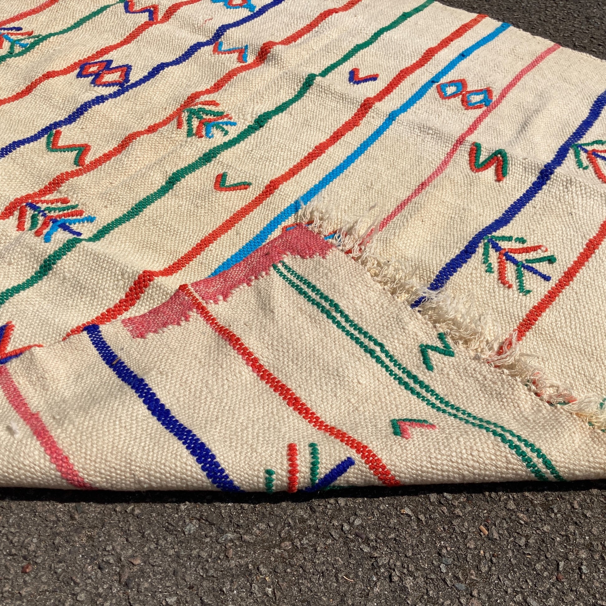 Vintage Boujad blanket from the 1990s. Handwoven in cotton featuring traditional triibal motifs and used as throws for beds or curtains and, in the winter months, as a haik or stole.
