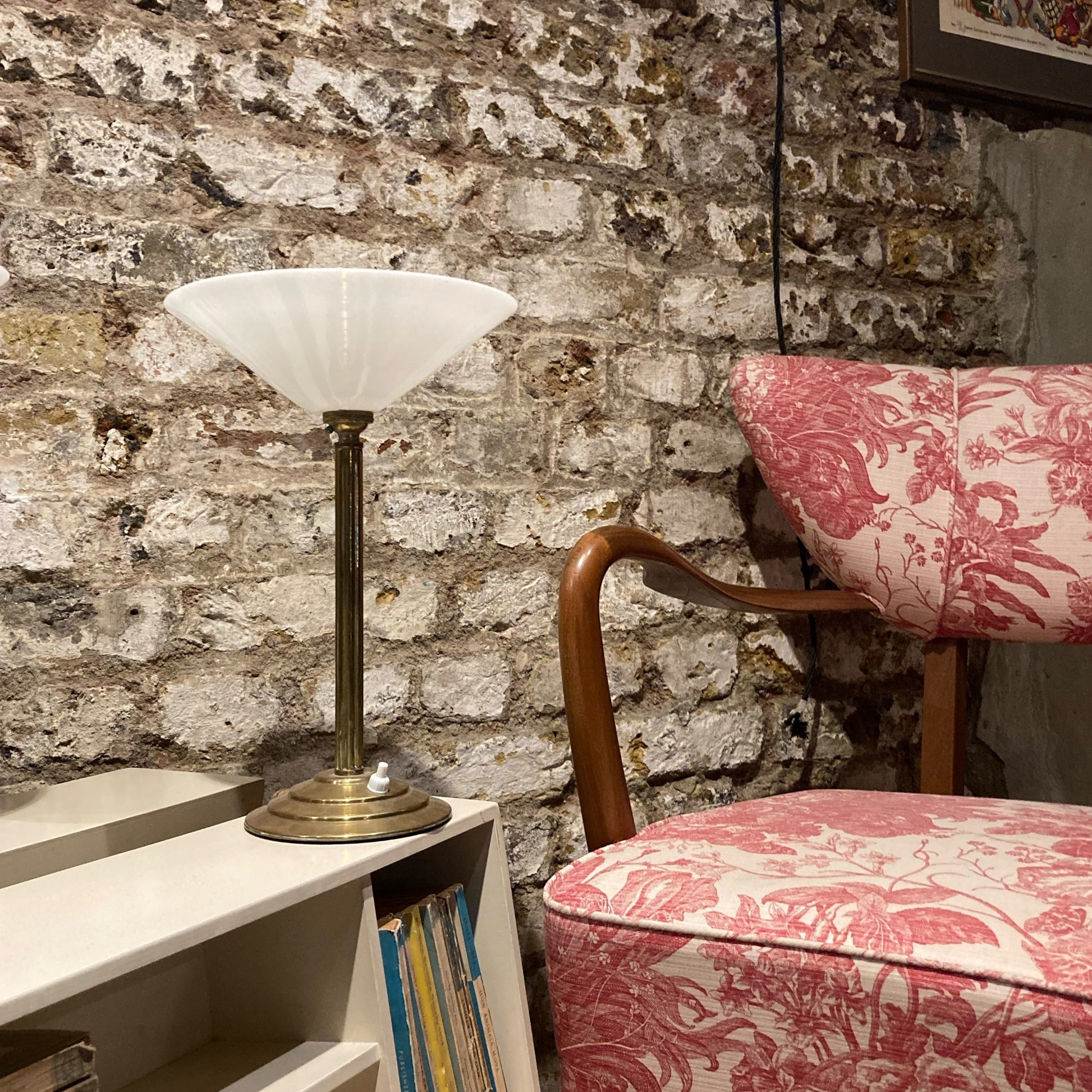 Pair of Art Deco table lamps with fluted brass bases and original white ceramic uplighter style shades.