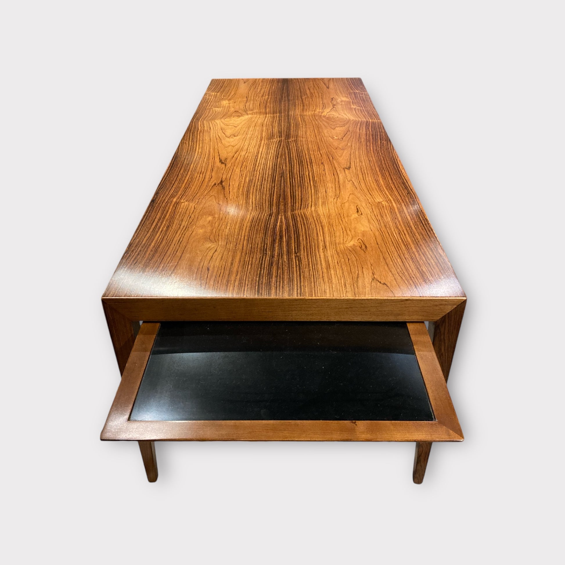 Extendable coffee table designed by Severin Hansen (Danish, 1903-1979). Made by Haslev Møbelsnedkeri, Denmark, in the 1960s. In keeping with Hansen's design style, this piece features an angular silhouette and tapered legs with beautifully crafted joinery. Made from rosewood, the table also has two extendable side panels with a black lacquered surface.