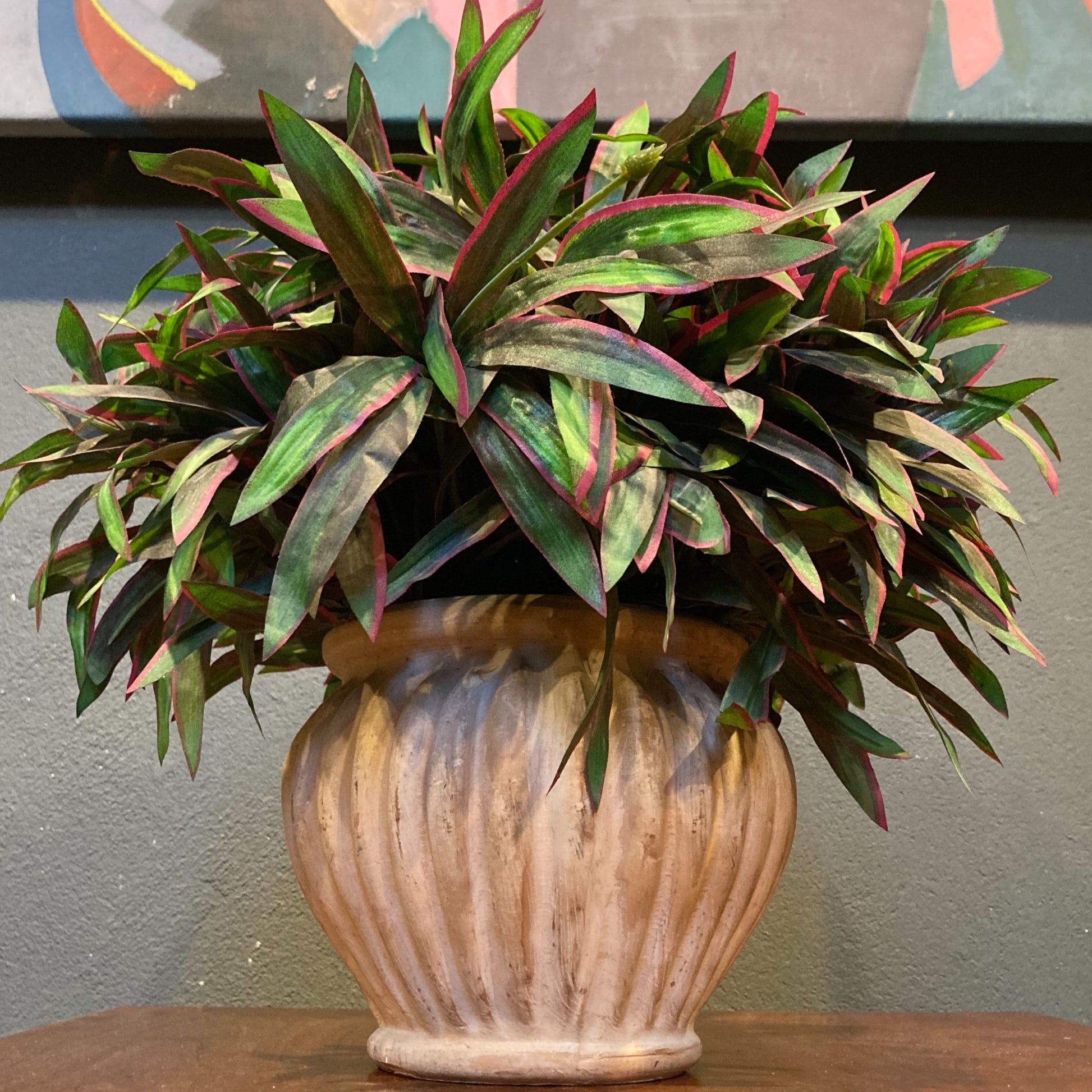 Pretty ribbed terracotta pot containing a faux houseplant.