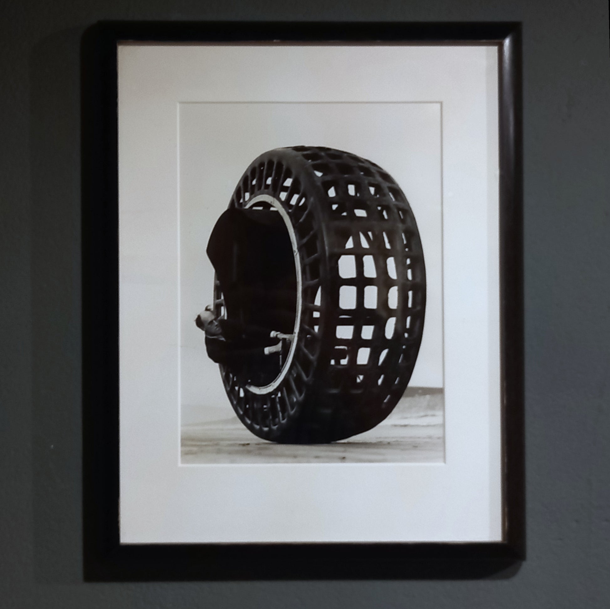 The Dynasphere, 1932, silver gelatin resin print. The Dynasphere was a giant electrically driven wheel, capable of speeds of 20mph, which revolves while the driver stays stationary. The image shows it being tested on the beach at Weston Super Mare by Mr JA Purves of Taunton, who invented the machine with his son.