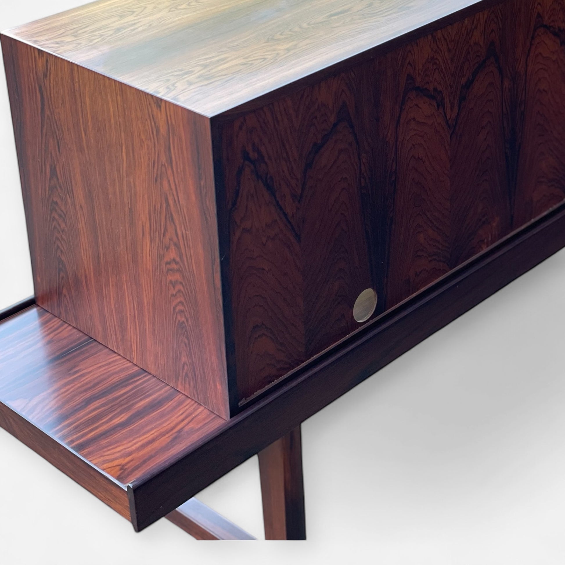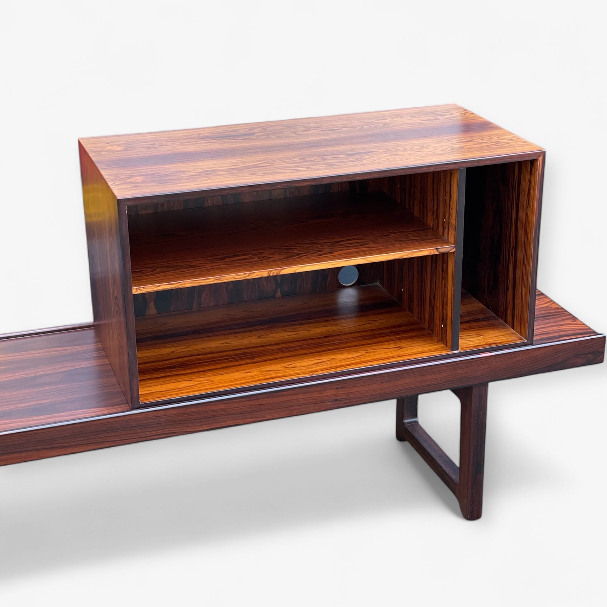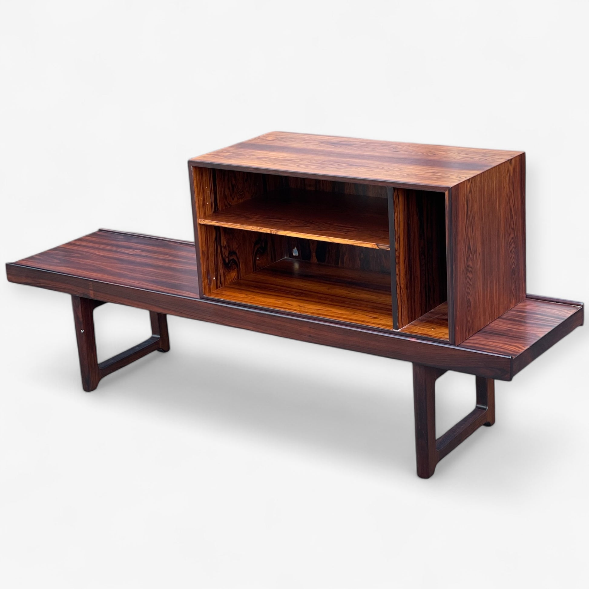Stylish rosewood bench or side table, model Krobo, with a matching storage box that sits along the top. The box has two small holes drilled at the back and would make an excellent hi fi display piece. It was designed by Torbjorn Afdal and produced by Bruksbo in Norway in the 1960s with a veneered top and solid legs.