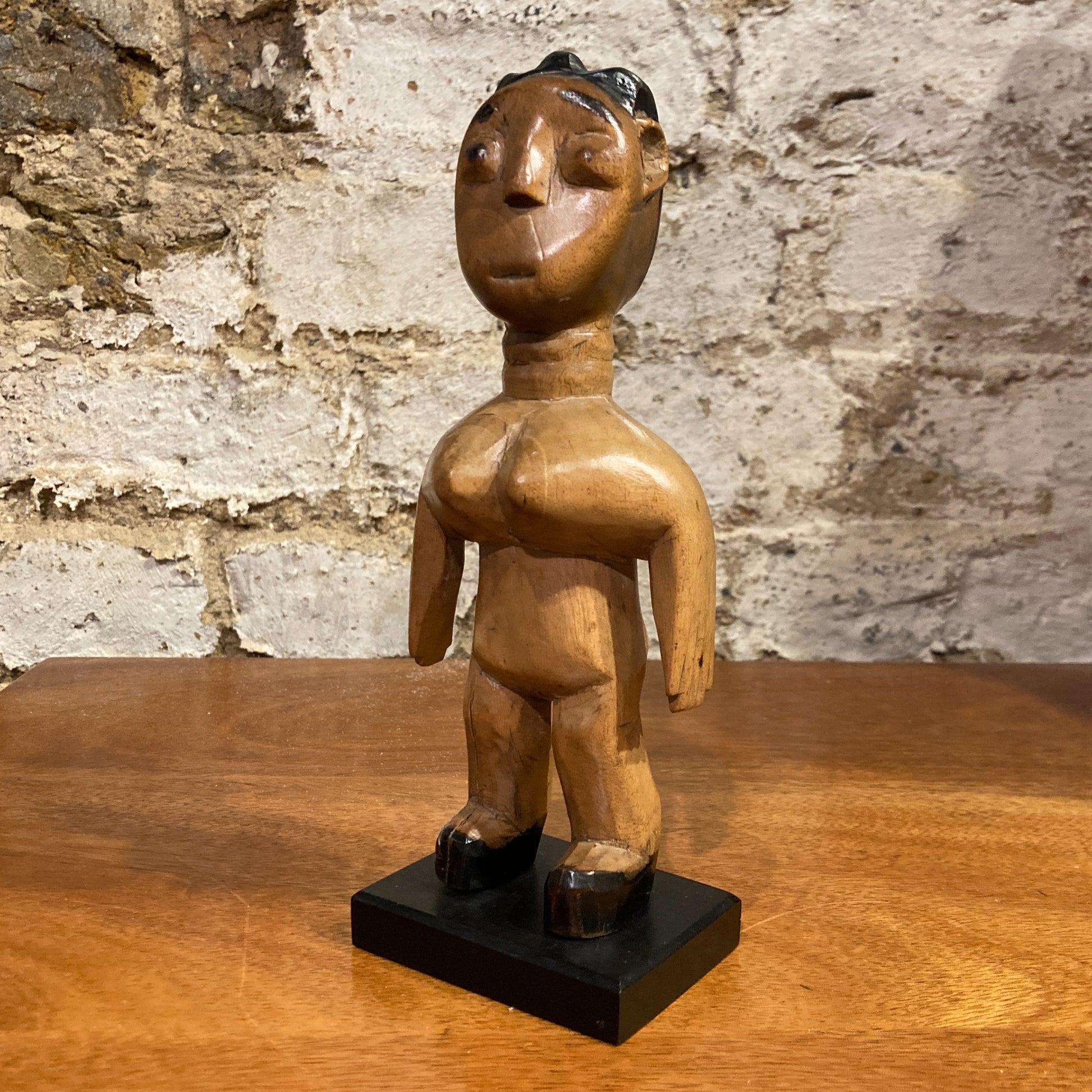 A trio of hand carved wooden dolls from the Ewe people of southern Togo and Ghana in West Africa. They are carved from the wood of the local kapok tree and have an aged honey coloured patina. Typical Ewe features on these dolls include the ovoid faces with protruding eyes and black pigment decoration on the hair and feet and around the torso. They are standing rigid, with their arms held away from their bodies, pointing straight down. Their carved fingertips show signs of red pigmentation. One of the figures is wearing a single layer of glass beads on a simple string around her waist.