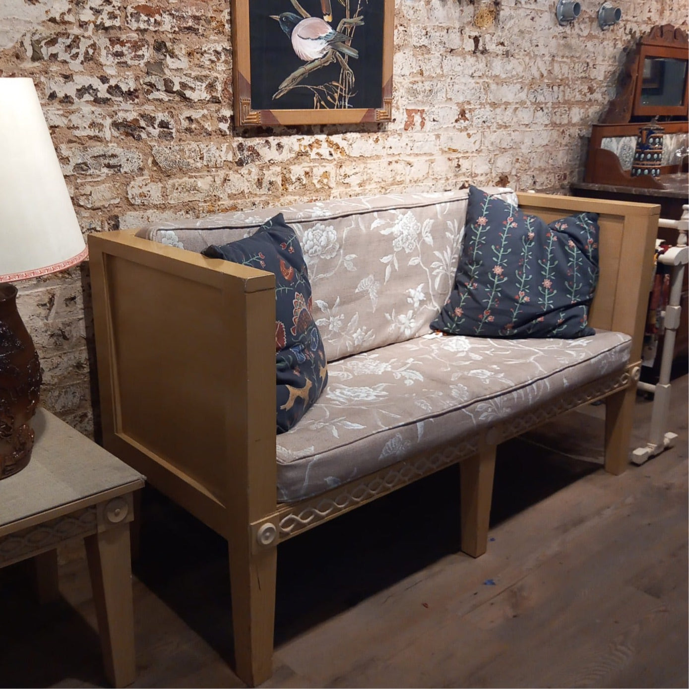 A lovely yellow painted hall bench measuring 159cm wide x 84cm high x 60cm deep with scrolling detailing and seat cushions in a patterned Osborne & Little linen fabric